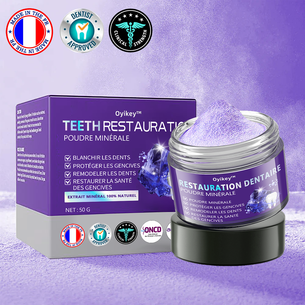 Oyikey™ Teeth Restoration Poudre Minérale élimine 99,99 % des bactéries, résout les problèmes de mauvaise haleine, élimine la plaque dentaire et le tartre, traite la gingivite et la parodontite, soulage les douleurs dentaires, prévient et traite les caries, restaure l'émail dentaire, stimule la formation de dentine réparatrice et soutient la régénération des dents perdues.